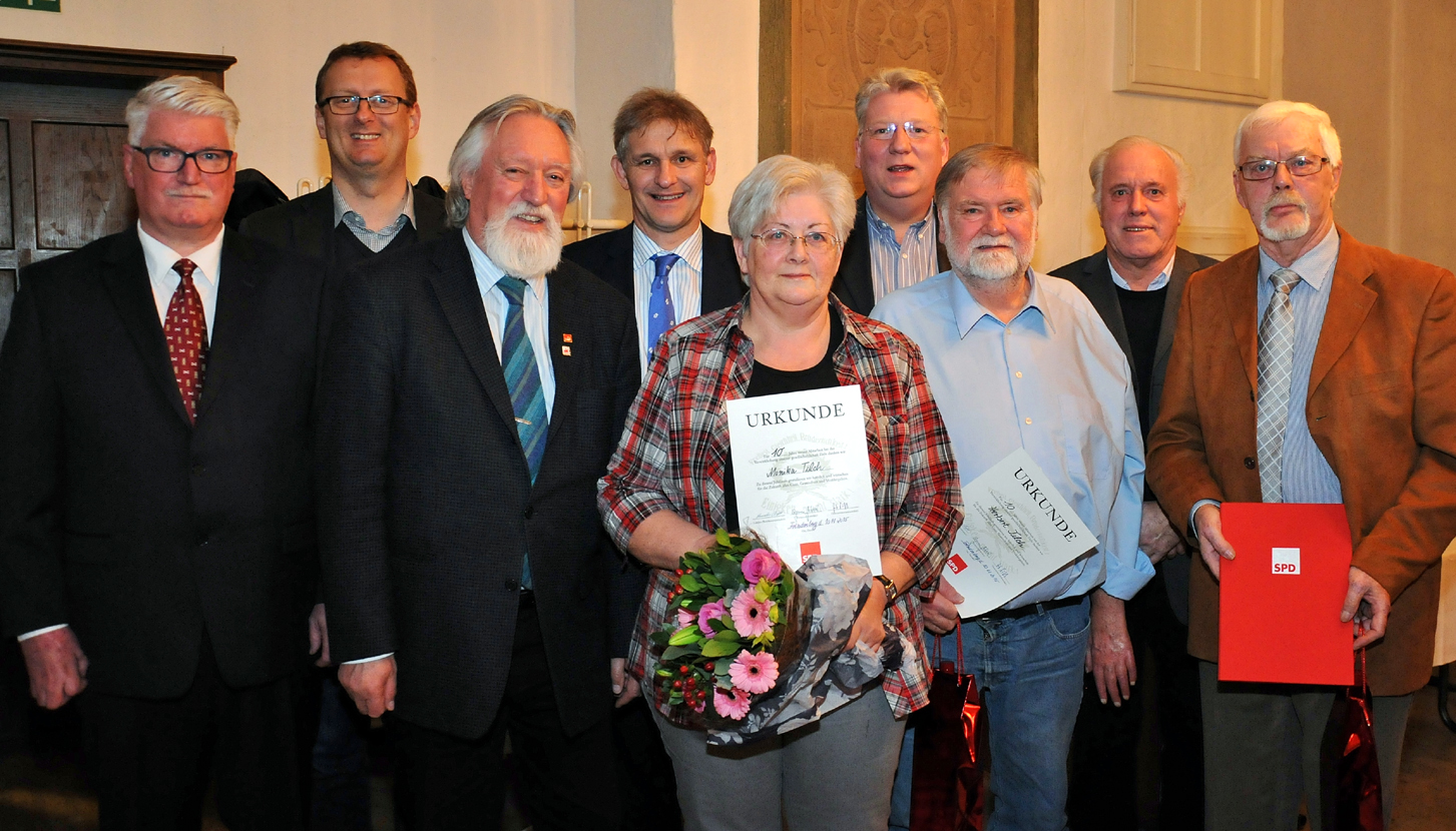Der Bundestagsabgeordneten Oliver Kaczmarek ehrte gemeinsam mit Landrat Michael Makiolla und Hartmut Ganzke den Geschäftsführer des Ortsvereins, Jürgen Wiechert, für 25 Jahre Parteimitgliedschaft sowie für zehn Jahre Mitgliedschaft die Eheleute Monika und Herbert Tilch. Aufgrund von terminlicher Verhinderung konnten Jana Kirejewski, Renate Schröer (zehn Jahre Mitglied), Erwin Schmitt (25 Jahre), Heribert Blum und Erika Agnes Rimbach (je 40 Jahre) und Karl Siepmann (50 Jahre Mitgliedschaft in der SPD) nicht persönlich geehrt werden. Diese Jubilare bekommen ihre Urkunden und kleine Geschenke im Laufe der Woche.