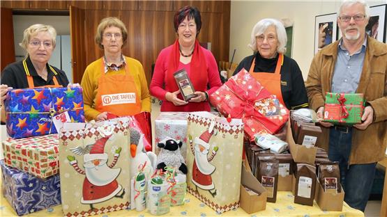 Weil diese Pakete allein für die 60 bis 70 wöchentlichen Kunden nicht ausgereicht hätten, um allen Tafel-Kunden zum Weihnachtsfest eine Freude zu bereiten, kam dem ehrenamtlichen Tafel-Team die Überraschung einer heimischen Apotheke gerade recht. Sie hatte hübsch verpackte Geschenktüten mit Duschgel, Tee, Notizzetteln, Brillenputztüchern und Pflegecremes gespendet. Der Kontakt war über die erfolgreiche Unterstützungsaktion bei grünen Rezepten entstanden, die so gleich doppelt Früchte trägt. Außerdem spendierte auch die SPD wieder fair gehandelten Kaffee.